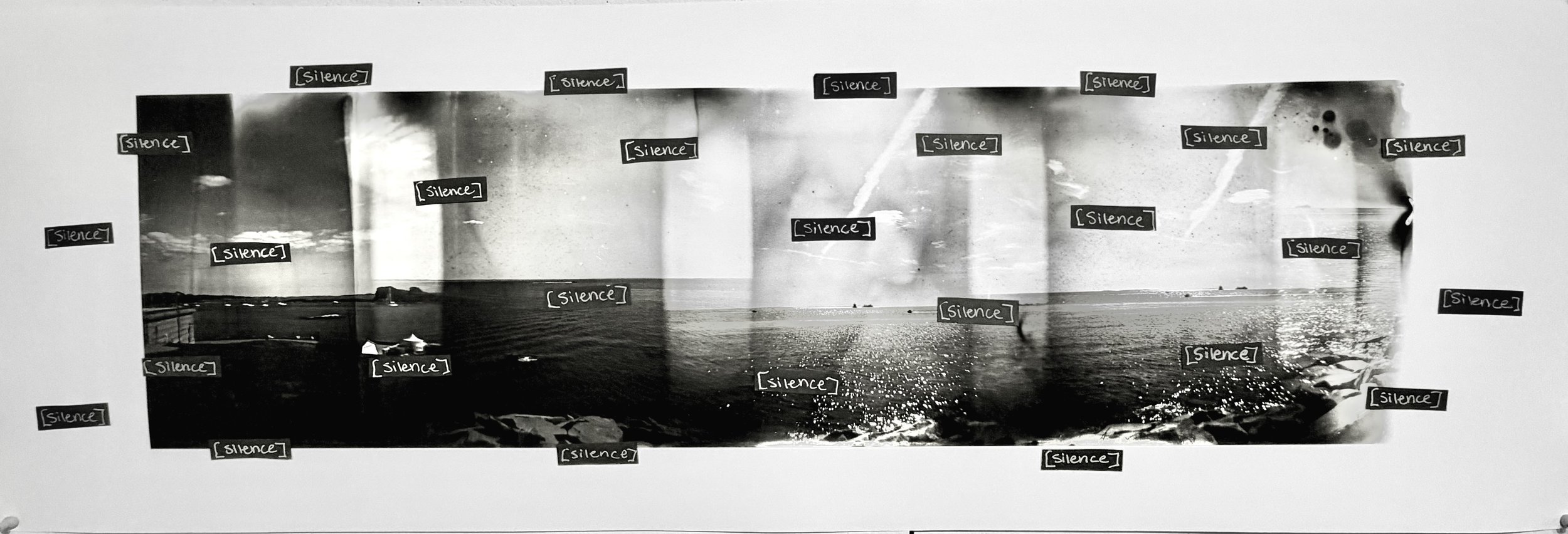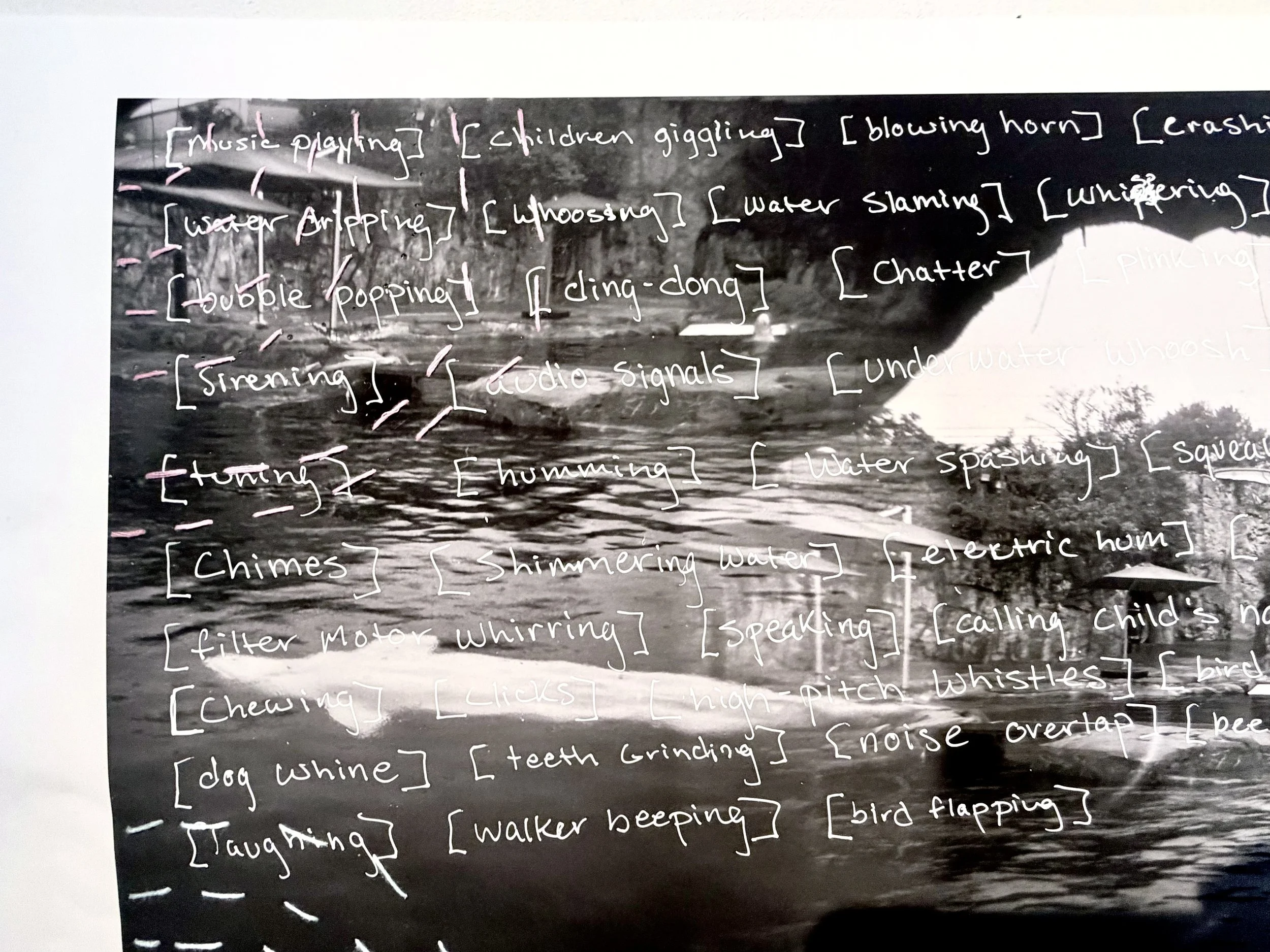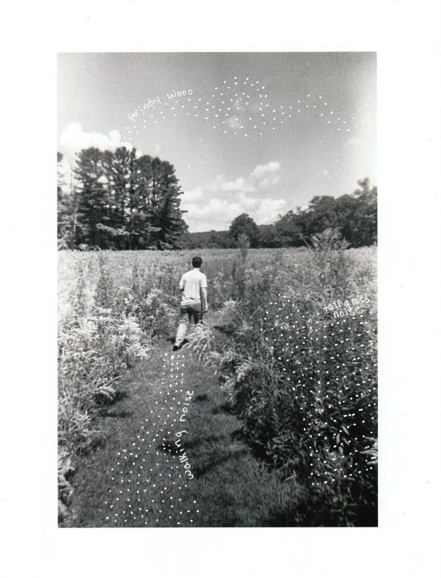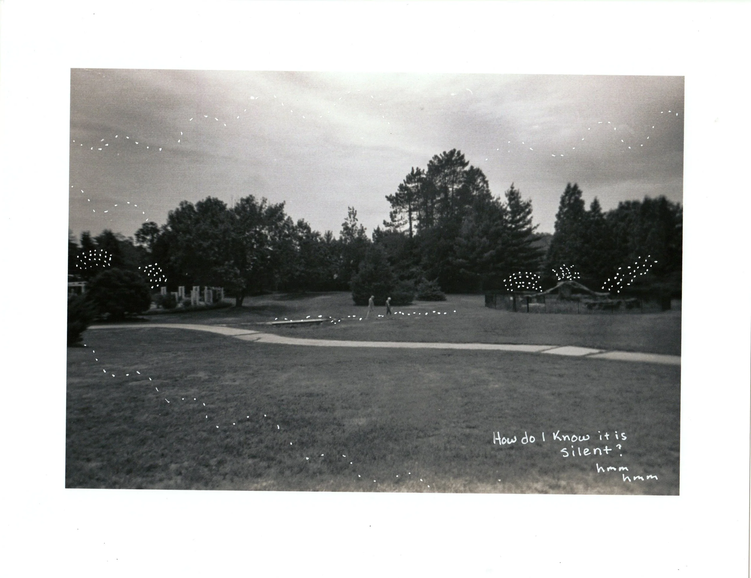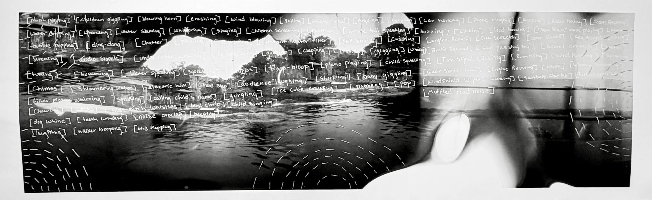 The project is ongoing, and I often work with 35mm and 120mm black and white film. I experimented with a white gel pen and colored strings. I play with the sound effect captioning to capture the moment that I find myself surrounded by the silent echo. I would start wondering, “What kind of noise?” and I would make assumptions or become familiar with the noises to define into words.